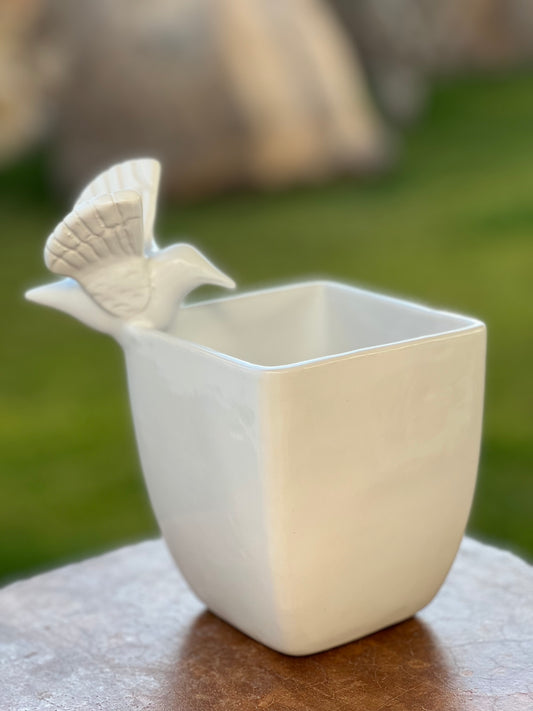 MACETA BLANCA CON COLIBRI Y ORQUIDEA
